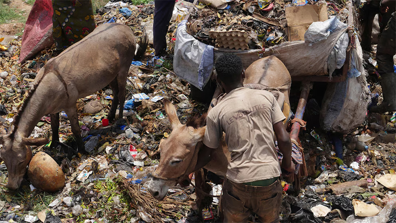 Residents are turning to donkey carts like Diallo’s for trash pickup. The carts can weave in and out of vehicle traffic and reach more places than trucks can, especially on bad roads.