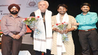 The visiting artists of Bee Seavers of Germany and Akshay Jadhav of Mumbai being felicitated by Regional Director ICCR Jammu, Balwant Thakur and Dr A S Amn, Additional Secretary, J&K Academy of Art, Culture and Languages.
