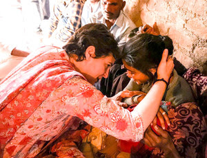 LALITPUR, Oct 29 (UNI):- Congress leader Priyanka Gandhi Vadra meeting family members of deceased farmer, in Lalitpur on Friday. UNI PHOTO-5U