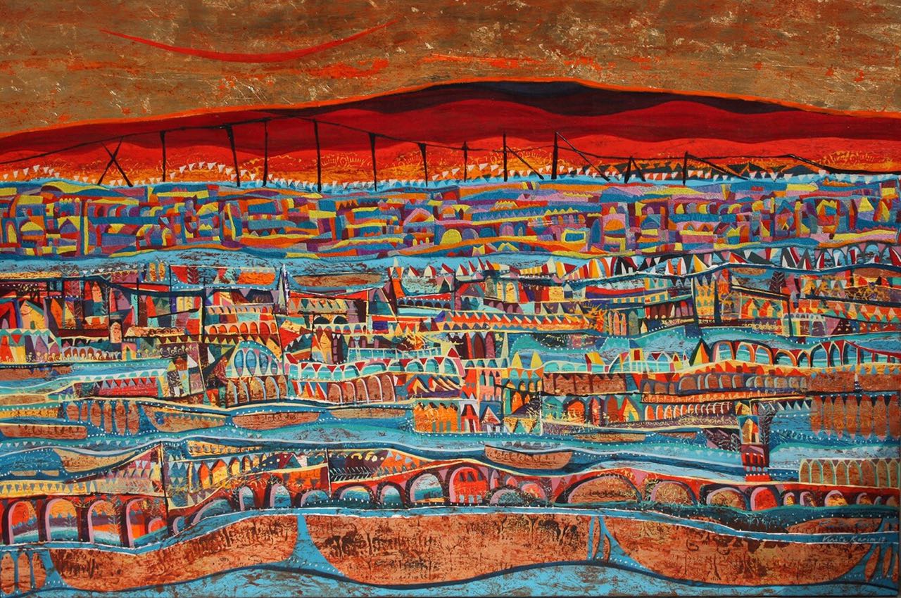 The imaginary spaces featuring clusters of houses against robust skies, and sometimes beautifully coloured streams or rivers, are products of Karim’s entire life, which she has, quite literally, lived out of a suitcase.