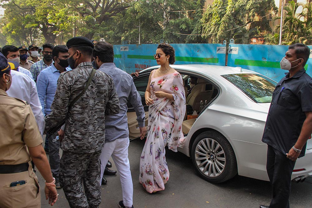 Kangana, who showed up at the police station in a white, floral saree, was surrounded by security and police officers. (AGENCIES)