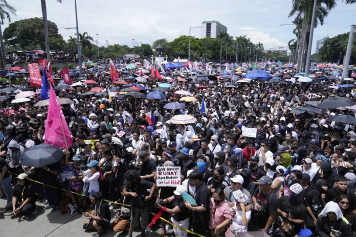 “I feel bad that we wallow in poverty and we lose our homes, our lives and our future while they rake in a big fortune from our taxes that pay for their luxury cars, foreign trips and bigger corporate transactions,” student activist Althea Trinidad told The Associated Press in Manila, where she joined a noisy crowd that police estimated at around 8,000 people by midday. “We want to shift to a system where people will no longer be abused.”