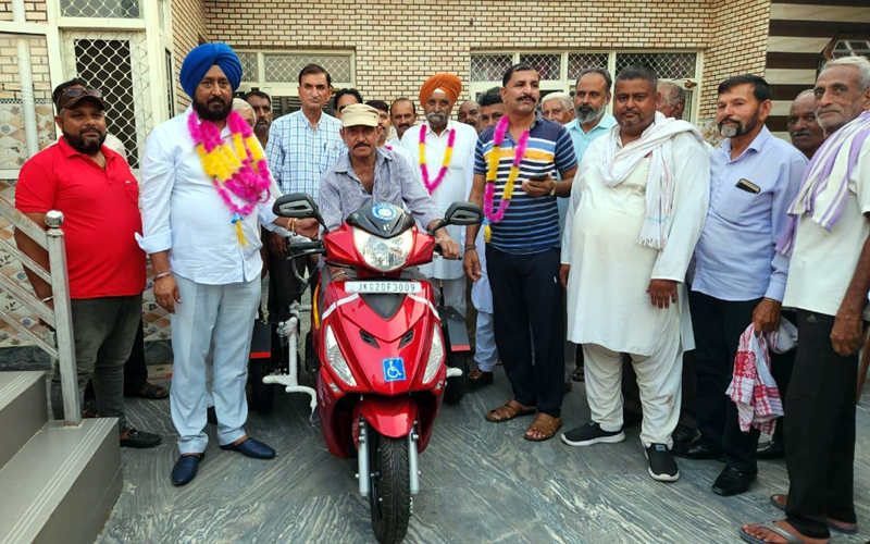 SUCHETGARH, Sept 1: Congress leader and DDC Member of Suchetgarh, Taranjit Singh Tony today handed over two-wheeler scooty to a specially abled person at village Boli Chak in Suchetgarh.
