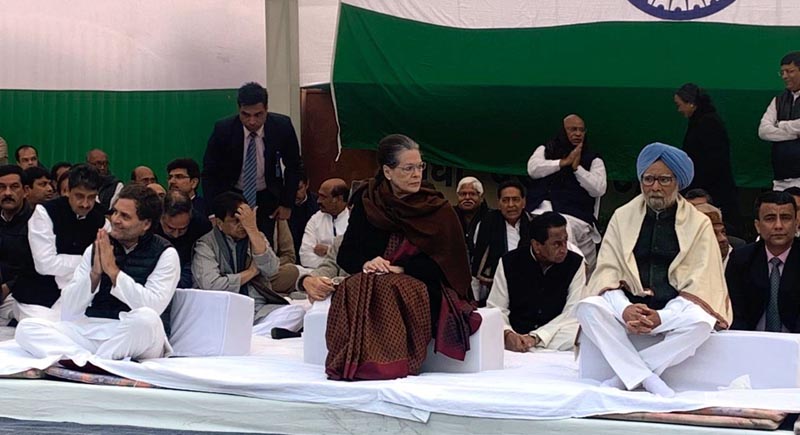 NEW DELHI, Dec 23: Top Congress leaders led by Sonia Gandhi on Monday sat on a ‘Satyagraha’ at Mahatma Gandhi’s memorial Rajghat here, demanding that the rights of people as enshrined in the Constitution be protected.