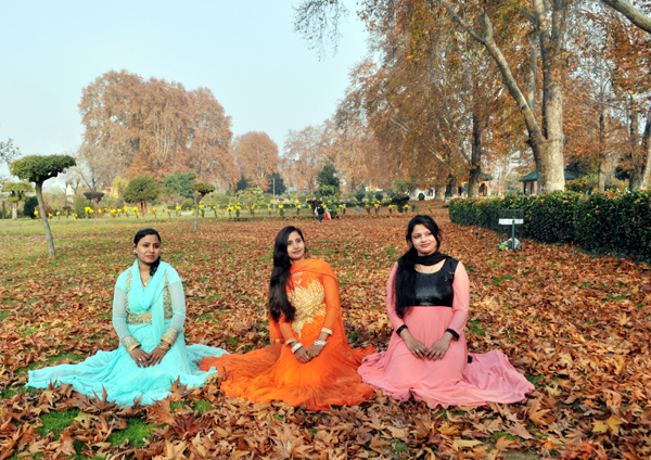 Tourist women from Mumbai pose for a photograph on the leaves of Chinar at Shalimar Mughal Garden in Srinagar on Wednesday. -Excelsior/Amin War