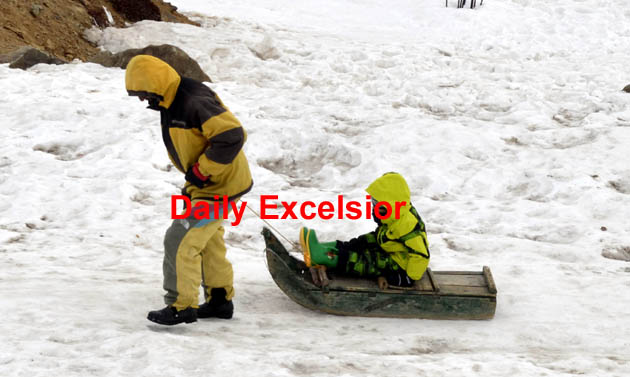 Tourists enjoy a ride on the sleigh at Afawat Gulmarg Resort as Kashmir braces for the coldest period Chilay Kalan of the winters in Kashmir on Sunday..Excelsior/Aabid Nabi