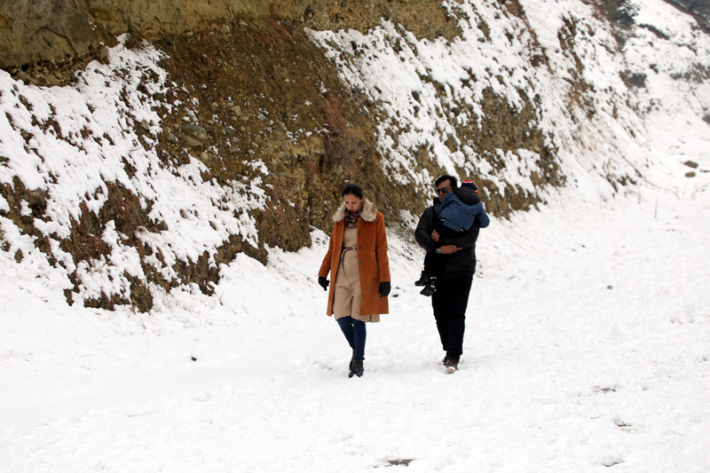 Srinagar, Jan 27:For the first time, tourists are seen thronging to Mughal Road in South Kashmir’s Shopian area to enjoy the snow, which is scarce at famous tourist resorts such as Gulmarg and Sonmarg.