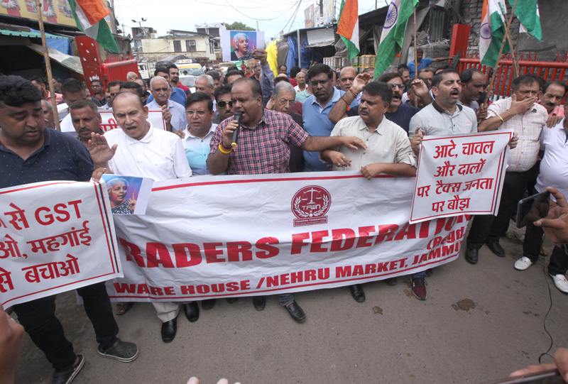 JAMMU, July 16: Showing strong resentment over the GST Council’s decision to levy 5 percent GST on pre-packed and pre-labelled food grains, curd, butter milk etc., different trade bodies under the banner of Traders Federation Ware House Nehru Market (Jammu) held a strong protest today.