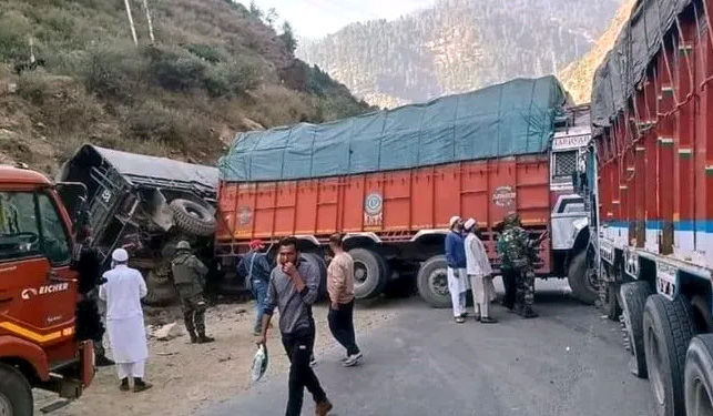 JAMMU, Oct 15: The vehicular traffic along the Jammu-Srinagar National Highway was halted on Tuesday after three trucks collided with each other near Nachlana in Ramban.