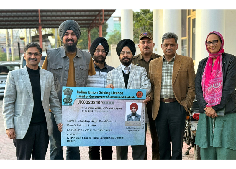 Transport Commissioner J&K Rajinder Singh Tara presenting Driving License to specially abled International player, Chandeep Singh.