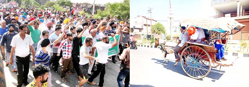 Transporters and operators taking out strong protest march in Jammu on Monday (L) and people travelling on horsecart in Kathua (R).-Excelsior/Rakesh/Pardeep