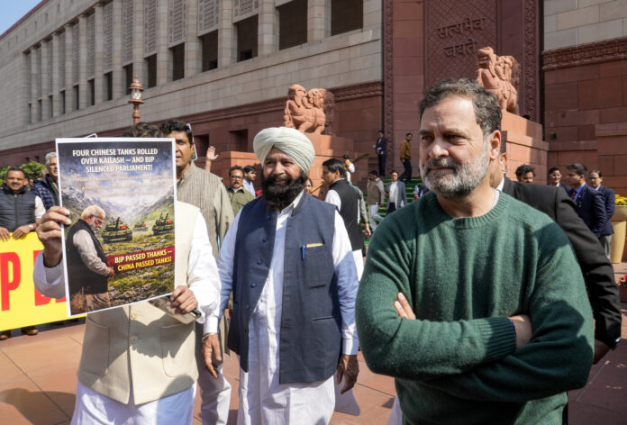 NEW DELHI, Feb 6: MPs from the Congress and some other opposition parties staged a protest in the Parliament House complex on Friday over the trade agreement with the US, the controversy surrounding former Army chief MM Naravane’s unpublished memoir, and the suspension of eight MPs.
