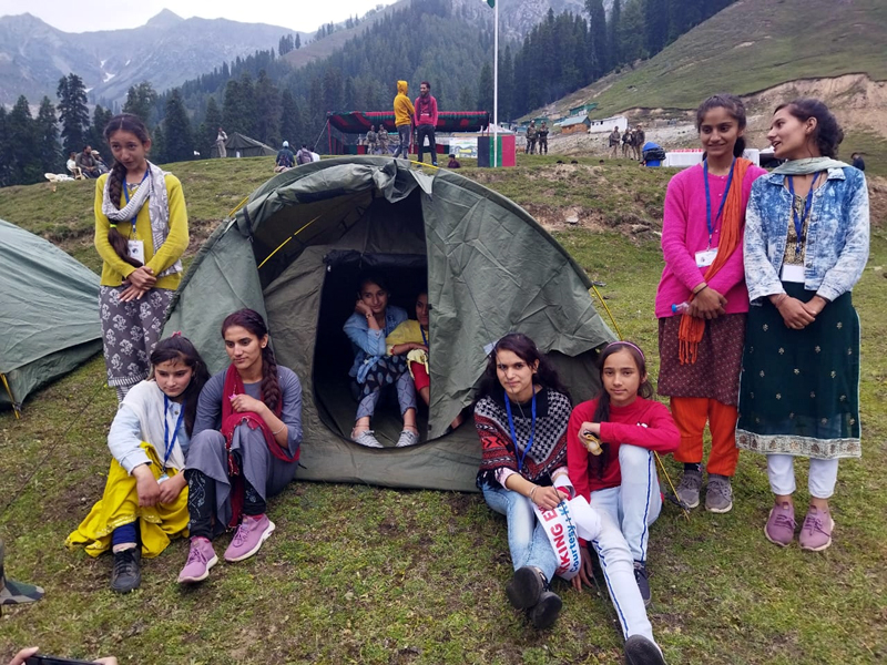 Trekkers posing for a group photograph at Sinthan Maidan Kishtwar on Saturday.