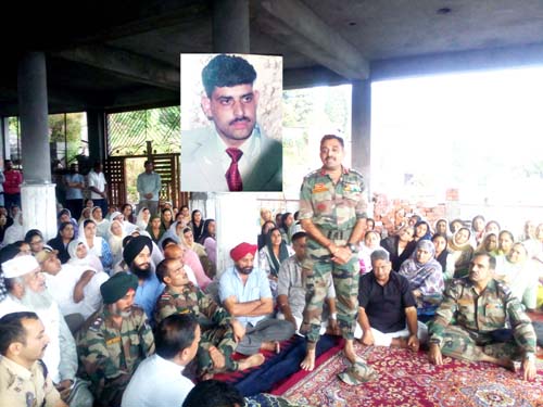 POONCH, Sept 23: Volunteers of various social and political organizations led by Deputy Chairman, Legislative Council, Jehangir Hussain Mir, organized a ‘shradhanjali samaroh’ to pay homage to the Martyr Rajinder Kumar, who sacrificed his life while performing duty in the recent fidayeen attack.