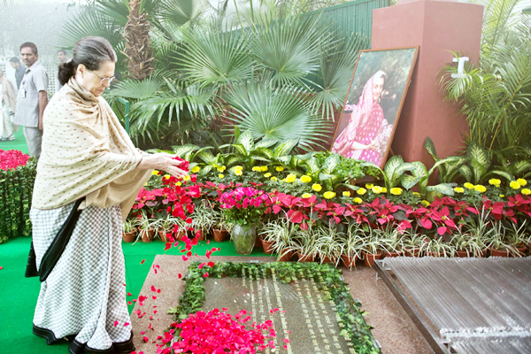 Congress President Sonia Gandhi paying floral tributes to former Prime Minister Indira Gandhi on the occasion of death anniversary at No 1, Akbar Road in New Delhi on Monday. (UNI)