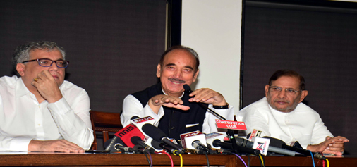 Trinamool Congress leader Derek O’Brien, Congress leader Ghulam Nabi Azad and Janata Dal rebel leader Sharad Yadav at a press conference in New Delhi on Tuesday. (UNI)
