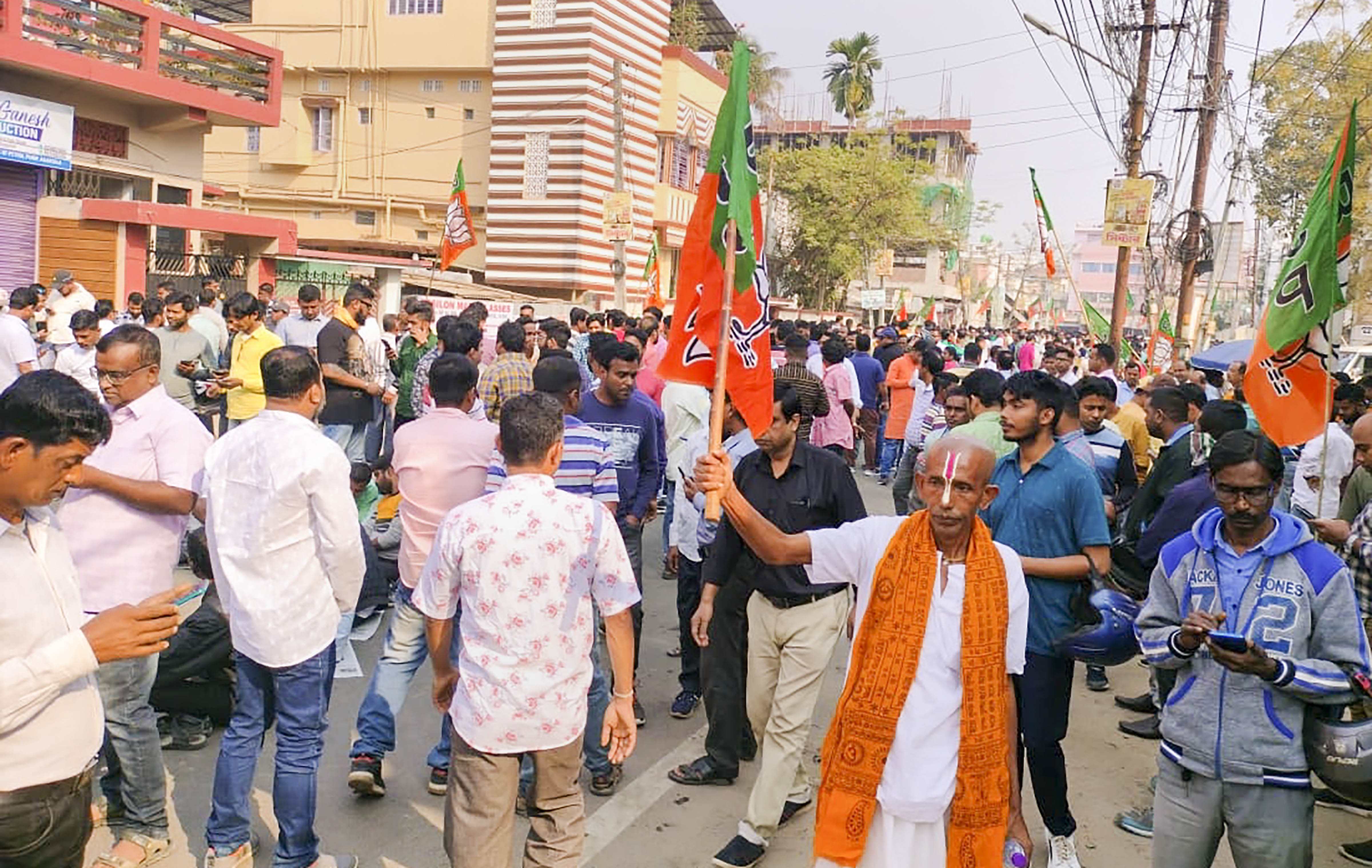 BJP workers gather outside the party office during counting of votes for Tripura Assembly elections, in Agartala.