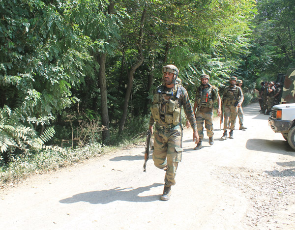 Troops rush towards the encounter site at Rakh-e-Lajoora on Tuesday. —Excelsior/Younis Khaliq