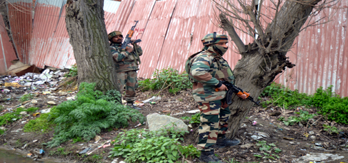 Troops take positions during attack on Yaripora police station on Friday. — Excelsior/Sajad Dar