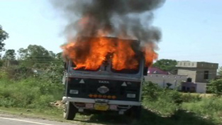 Truck carrying bovines which was set ablaze by mob at Ghagwal on Sunday. —Excelsior/Gautam
