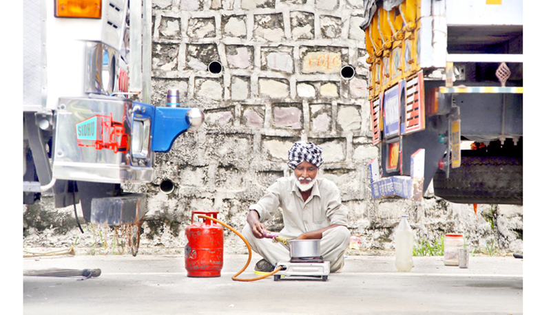 Truck driver cooks food before heading towards his further journey on the outskirts of Jammu. -Excelsior/Rakesh