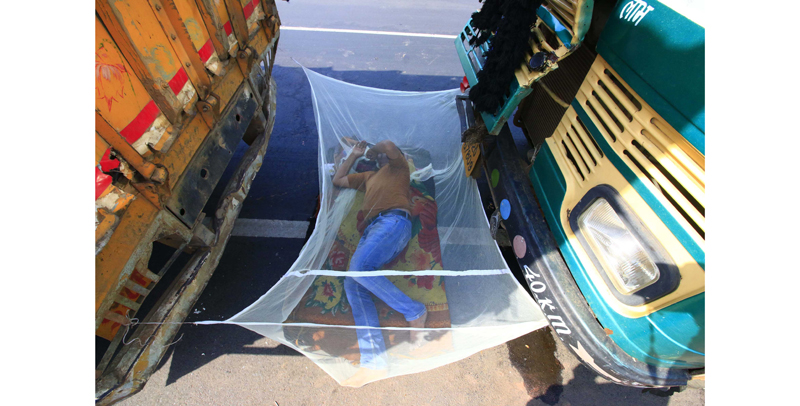 Truck drivers sleeping inside a Mosquito net on a highway during nationwide lockdown in Jabalpur on Sunday. (UNI)