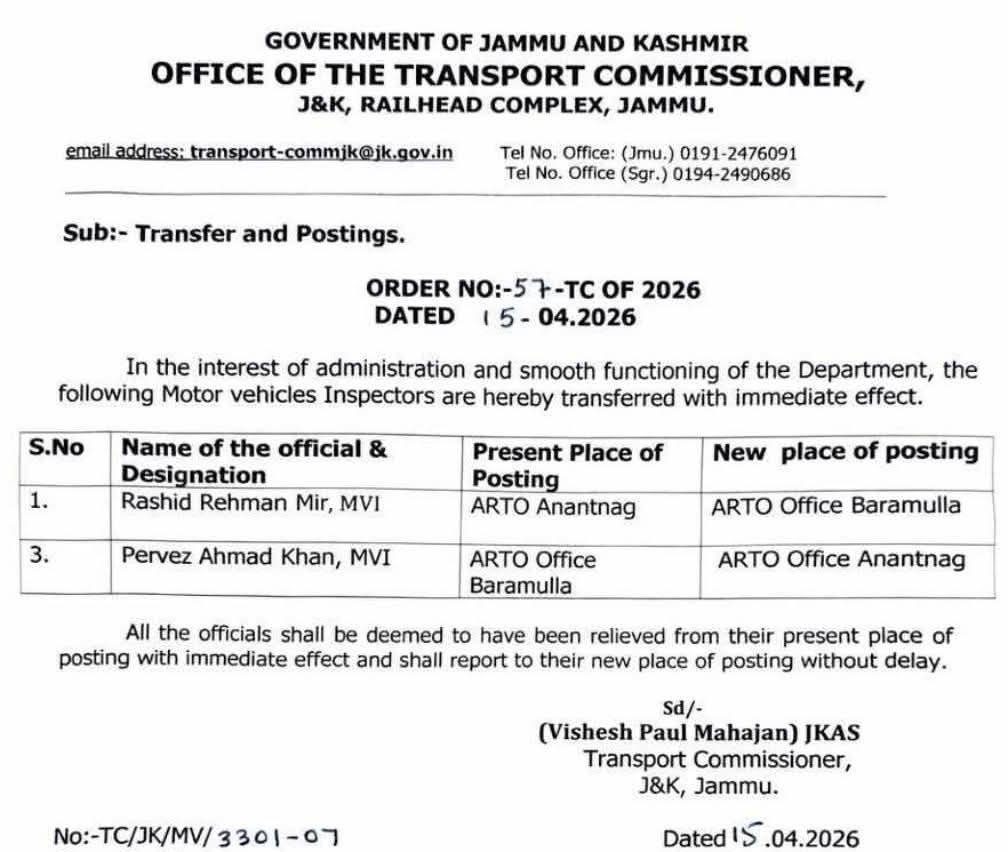 SRINAGAR, Apr 15: The Transport Commissioner, Jammu and Kashmir, has ordered the transfer and posting of two Motor Vehicles Department (MVD) Inspectors.