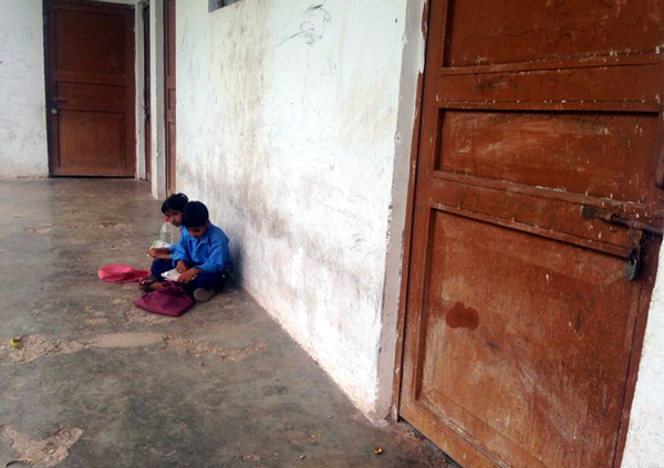Two children sitting in ‘veranda’ of locked Govt. Primary School in Palma area of Rajouri on Wednesday.