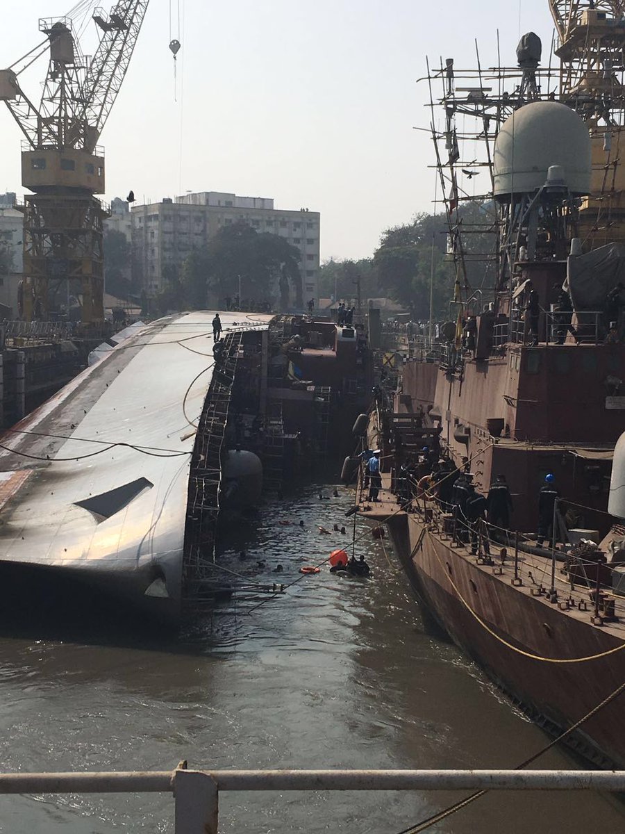 Explaining the situation, he said the 3,850-tonne ship, having a length of 126 metres, tipped over while it was being undocked. The mast of the ship hit the dockyard ground, he said.