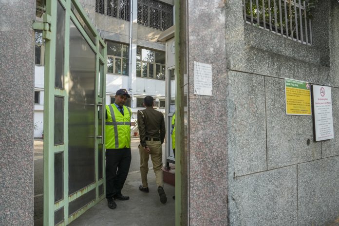 A police personnel enters into DPS RK Puram to conduct investigation after it received bomb threat, in New Delhi