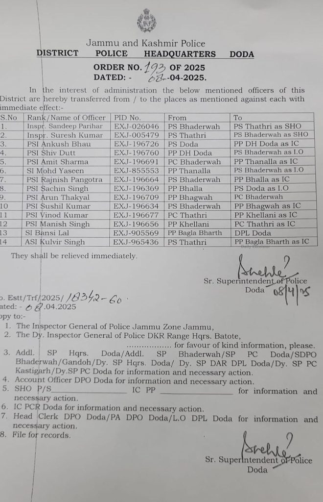 Two SHOs Among 14 Police Officers Transferred By Daily Excelsior - April 8, 2025 Share FacebookTwitterWhatsAppPinterestLinkedinCopy URLTelegramEmailTumblrReddItPrintKoo JAMMU, Apr 8: The Senior Superintendent of Police (SSP) Doda has transferred 14 police officers, posting two among them as Station House Officers (SHOs). Follow our WhatsApp channel