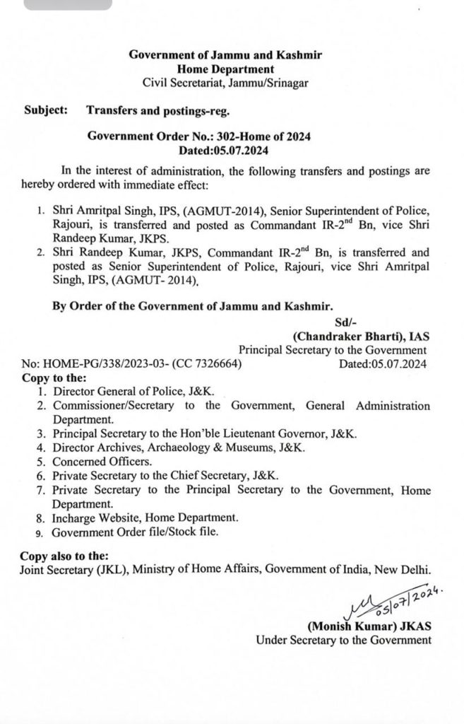 As per an order issued by the Home Department, Amritpal Singh, SSP Rajouri, has been transferred and posted as Commandant IR Second Battalion vice Randeep Kumar, who has been transferred and posted as SSP Rajouri.