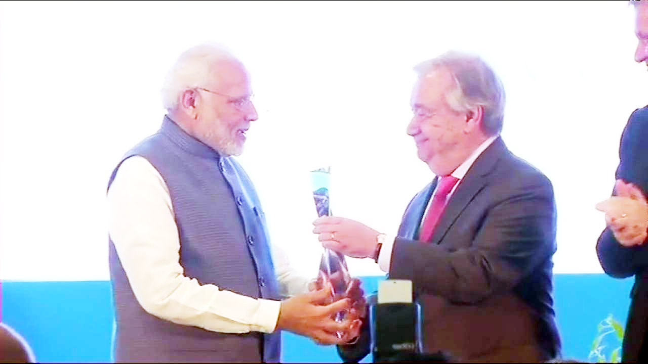 NEW DELHI: Prime Minister Narendra Modi was presented the UN’s Champions of the Earth Award by United Nations Secretary General Antonio Guterres here Wednesday.