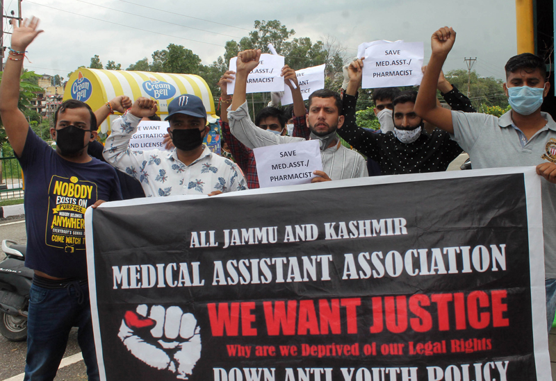 JAMMU, Aug 27: A score of youth who have completed courses of medical assistants and pharmacists today staged a protest in Jammu demanding issuance of registration and license of pharmacist and medical assistant.