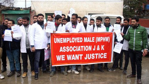 Srinagar, Feb 20: Unemployed Male Multi-Purpose Health Workers (MMPHWs) today staged a protest here and demanded advertising of job posts in Health Department.