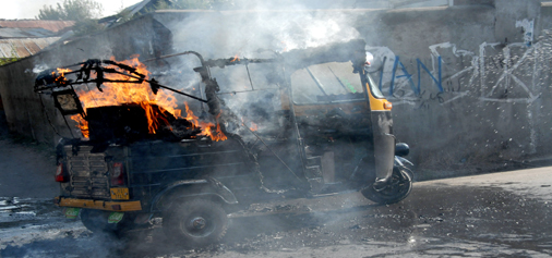 Unidentified persons set ablaze an auto-rickshaw for defying shutdown at Saida Kadal in Srinagar on Tuesday. —Excelsior/Shakeel