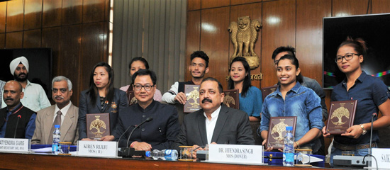Union DoNER Minister Dr Jitendra Singh, flanked by MoS Home Kiren Rijiju, posing for photograph with the Rio Olympics youth participants from Northeast, at New Delhi on Tuesday.