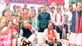 Union Finance Minister and BJP Election “Prabhari” Arun Jaitley, flanked by Union Minister and “Sah-Prabhari” Dr Jitendra Singh and local MP Darshanaben, at a public rally at Surat (West) constituency, Gujarat on Sunday.