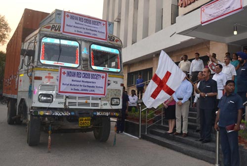Union Health and Family Welfare Minister Ghulam Nabi Azad, who is also Chairman Indian Red Cross Society, flags off Red Cross relief for earthquake affected districts of Doda and Kishtwar in New Delhi on Tuesday. (UNI)