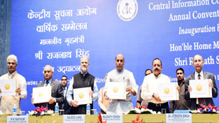 Union Home Minister Rajnath Singh, flanked by Union Minister Dr Jitendra Singh and Lt. Governor Najeeb Jung, releasing a book on RTI success stories at the Annual Convention of Central Information Commission, at New Delhi on Monday.