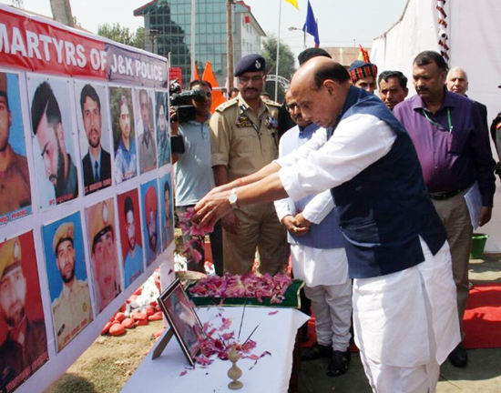 Union Home Minister Rajnath Singh paying floral tributes to martyrs at DPL Anantnag on Sunday.