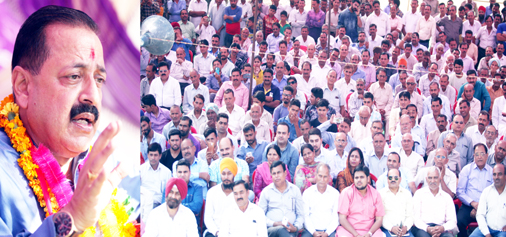 Union Minister, Dr Jitendra Singh addressing a public meeting after dedicating to public, the new bridge on river Bhini in Billawar on Wednesday.
