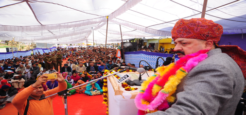 Union Minister Dr Jitendra Singh addressing a public meeting at Ghordi in Chenani Assembly segment of district Udhampur on Tuesday.