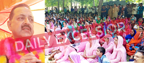 Union Minister, Dr Jitendra Singh addressing a public meeting at remote village of Panjar in district Udhampur on Wednesday. —Excelsior /Rakesh