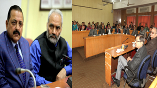 Union Minister Dr Jitendra Singh addressing an interactive session with the academic faculty of Jammu University, at Jammu on Saturday.