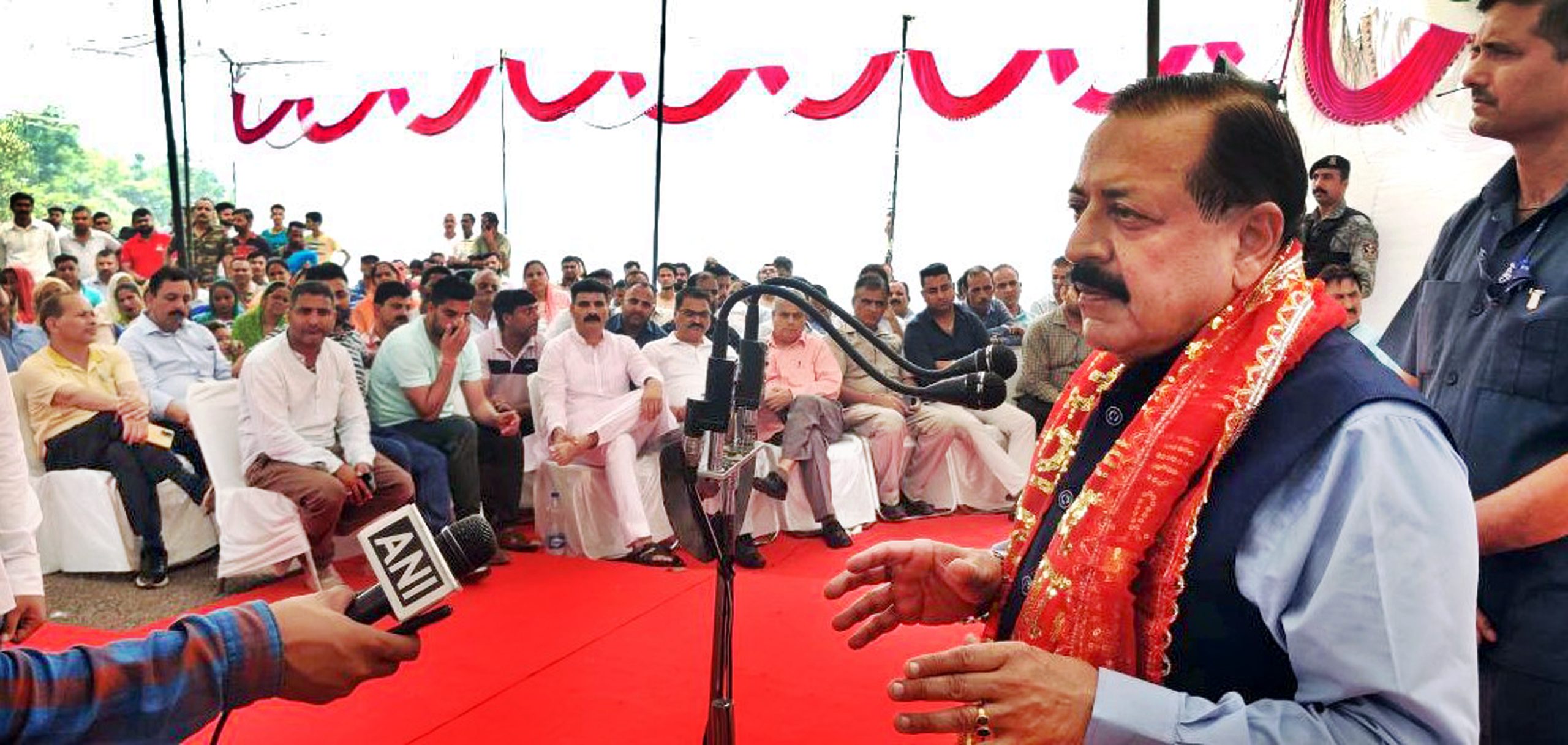 Union Minister Dr Jitendra Singh addressing the gathering after launching 'Meri Maati Mera Desh' campaign at Tikri in Udhampur on Sunday.