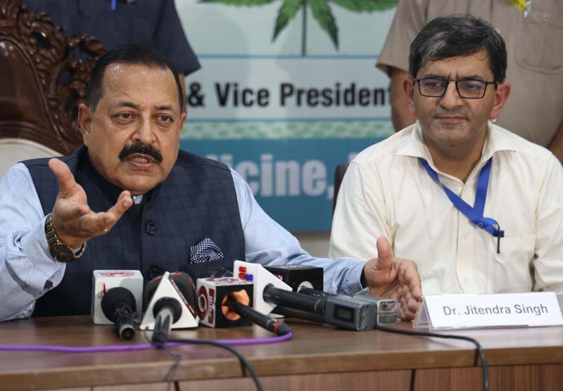 Union Minister Dr Jitendra Singh along with Dr Zabeer Ahmed, Director CSIR IIIM Jammu talking to reporters on Sunday. -Excelsior/Rakesh
