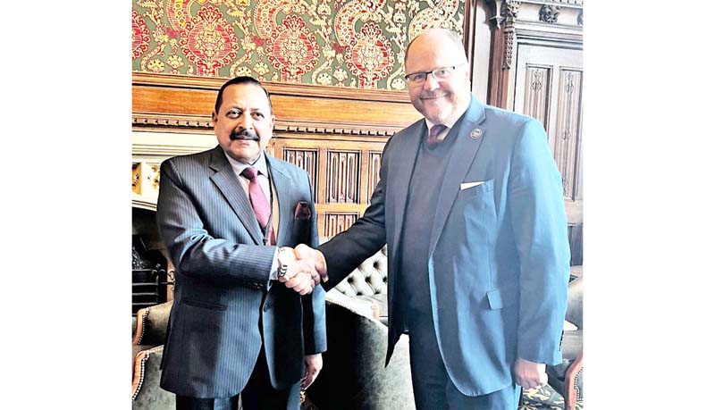 Union Minister Dr Jitendra Singh and his UK counterpart Science Minister George Freeman exchanging greetings before holding a one-on-one meeting in the British Parliament House, at London on Wednesday.