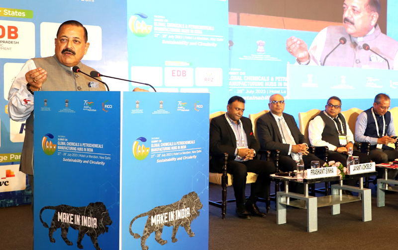 Union Minister Dr Jitendra Singh, as chief guest, addressing the “Global and Petrochemical Manufacturing Hubs” Summit-2023 at New Delhi on Friday.
