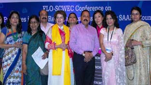 Union Minister Dr Jitendra Singh as chief guest, flanked by Shaista Pervaiz Malik, Member of Pakistan National Assembly and Saber Ahmed Koli,Director Bangladesh Chambers of Commerce and Industry, posing for a photograph with representatives from different countries at the SAARC Women Entrepreneurs' Conference at New Delhi on Friday.
